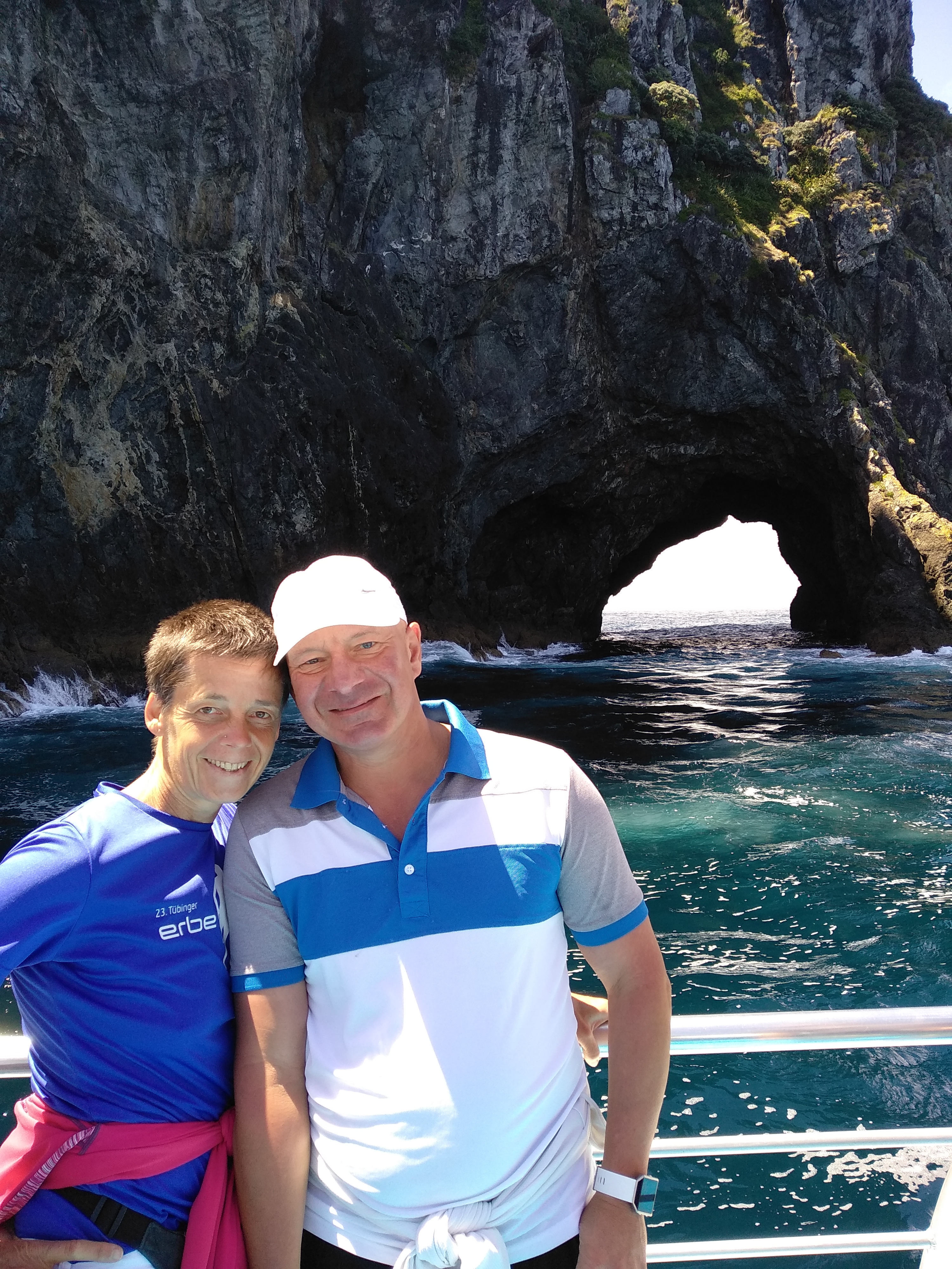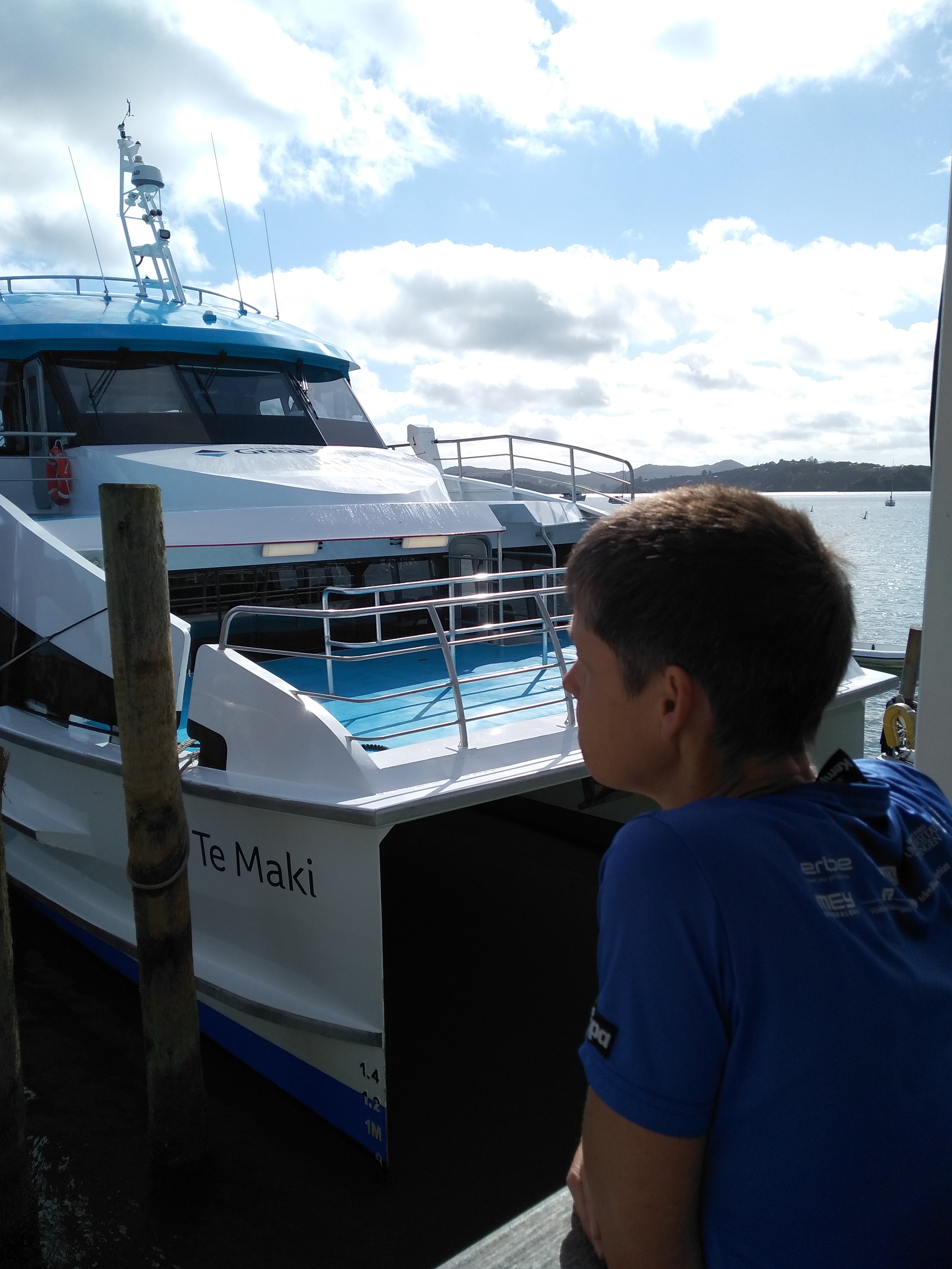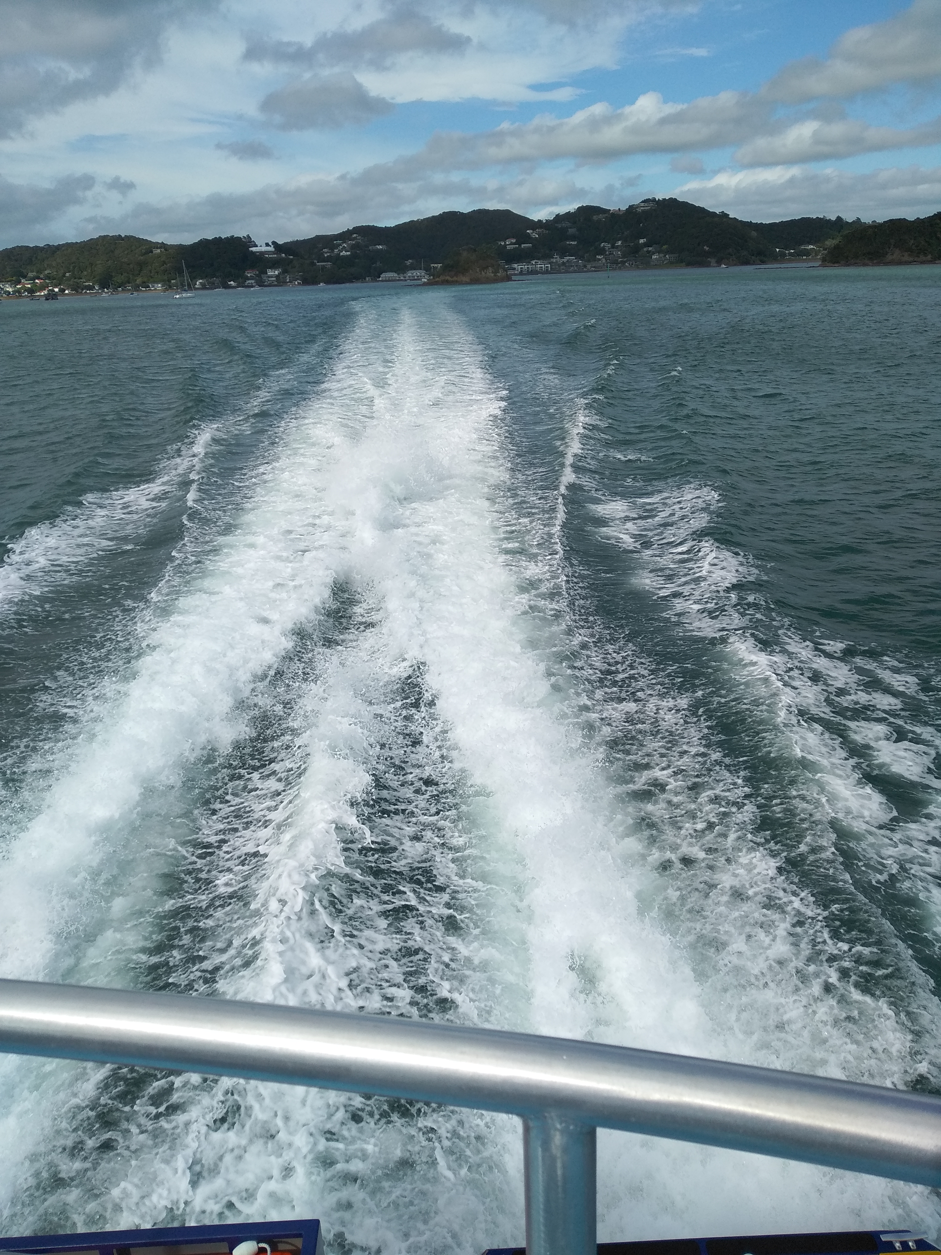 Diesen Sonnentag pur in Worte zu fassen, ist schier unmöglich und unsere Bilder sagen mehr als tausend Worte! Begleitet von Delphinen mal schnell, mal langsam durch die 144 Inseln zu „Katamaranen“ war unbeschreiblich schön. Eine nette Crew auf dem Schiff hat uns viel über die Geschichte der Region erzählt, wo 1769 James Cook landete, wo im 19. Jahrhundert die ersten Missionare keinen Erfolg hatten, die Maoris zu bekehren und wo Anfang des letzten Jahrhunderts ein findiger Neuseeländer die Idee hatte, aus der Versorgungslinie für die Inseln eine erste touristische Attraktion zu machen. Aufgrund dieser Tradition haben wir heute auch noch die Post vorbeigebracht an Inseln, die in Privatbesitz sind.