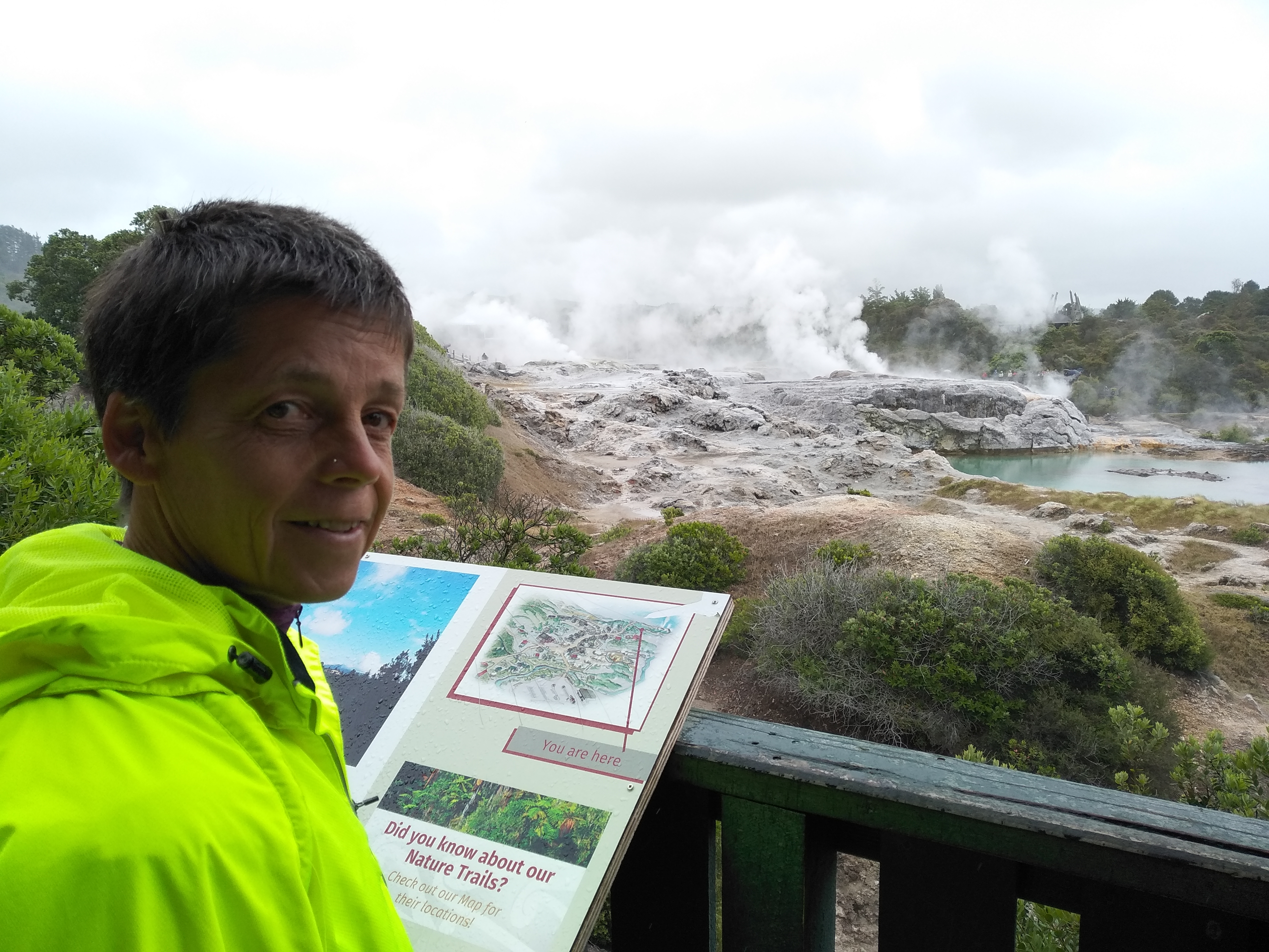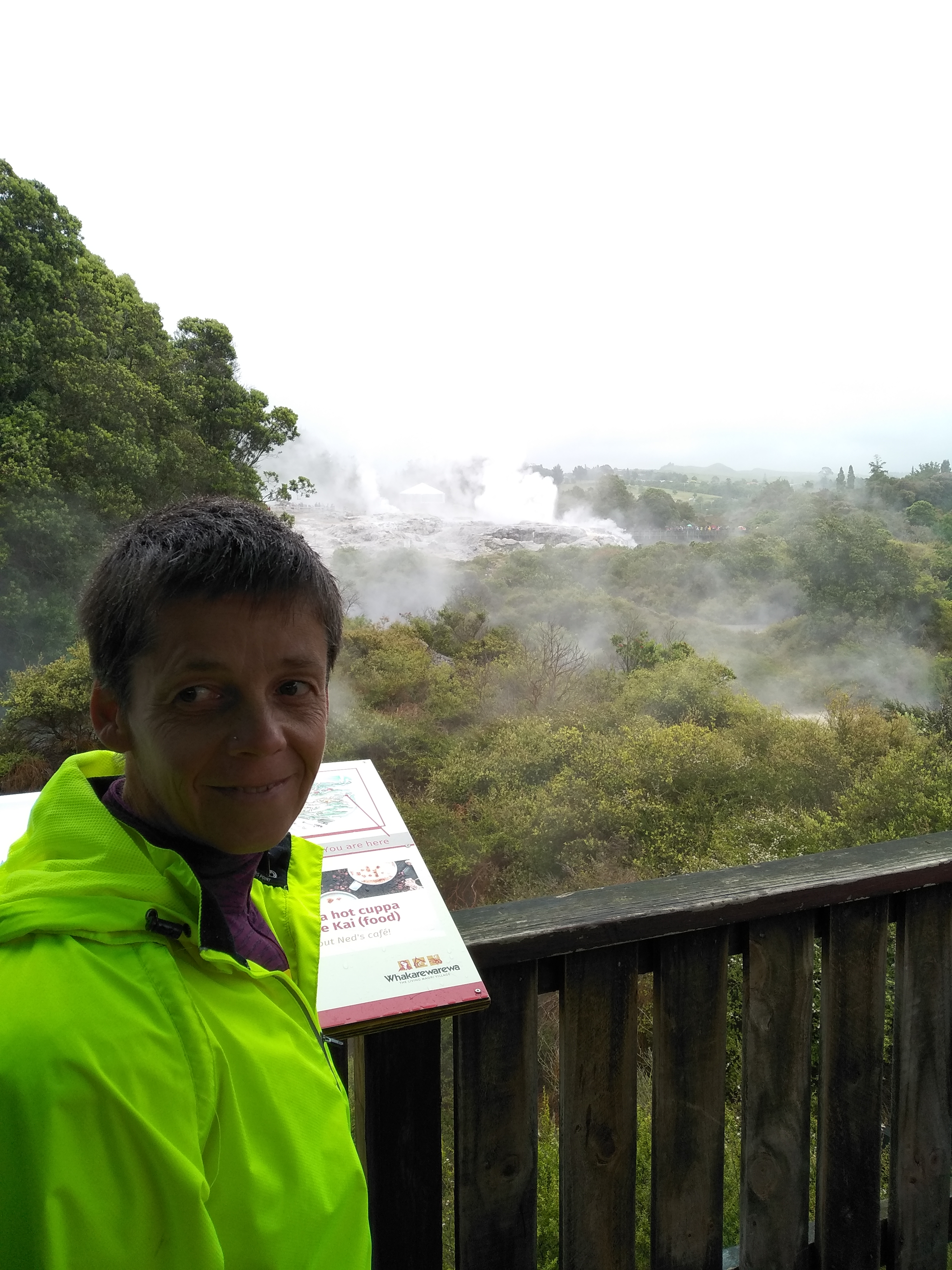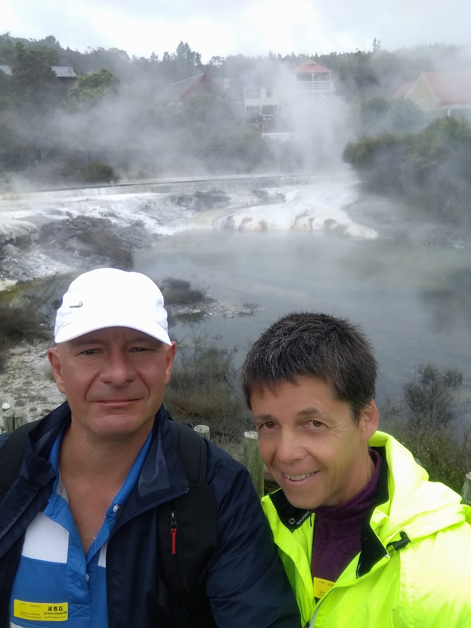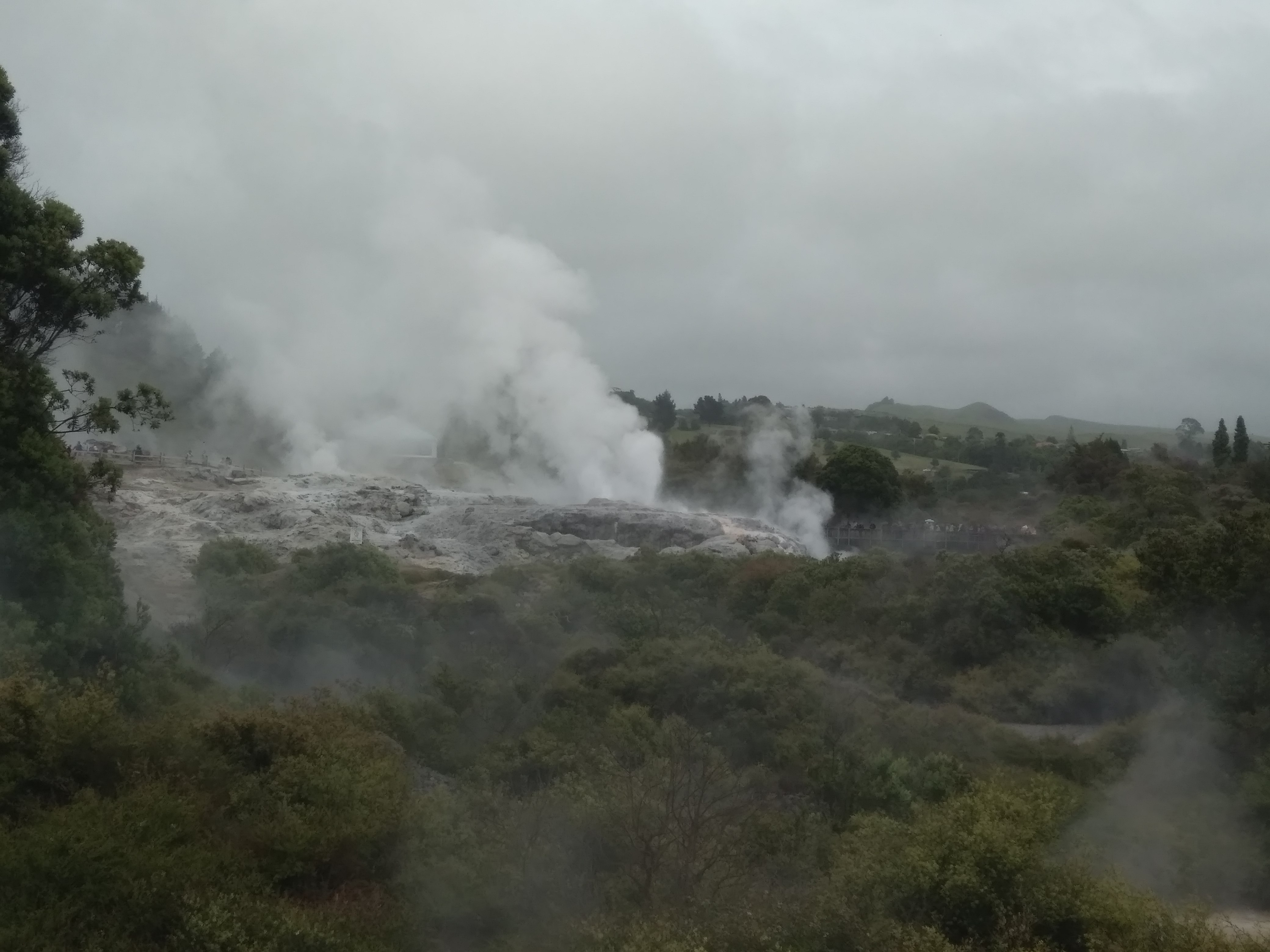 Nun sind wir in Rotorua, wo die Erde aus heißen Quellen blubbert und hohe Geysire spucken! Die Luftfeuchtigkeit von unten und oben ist sehr hoch!