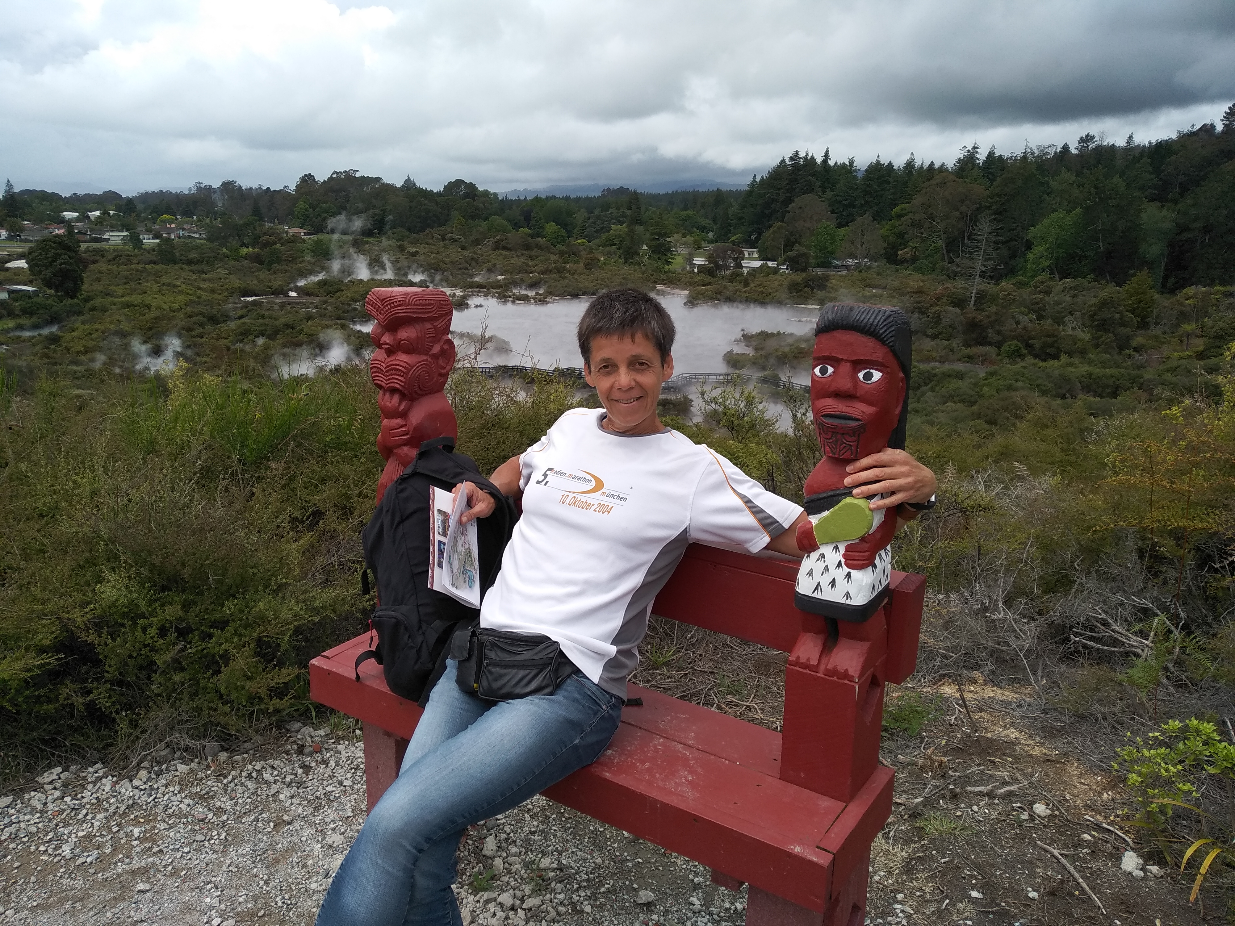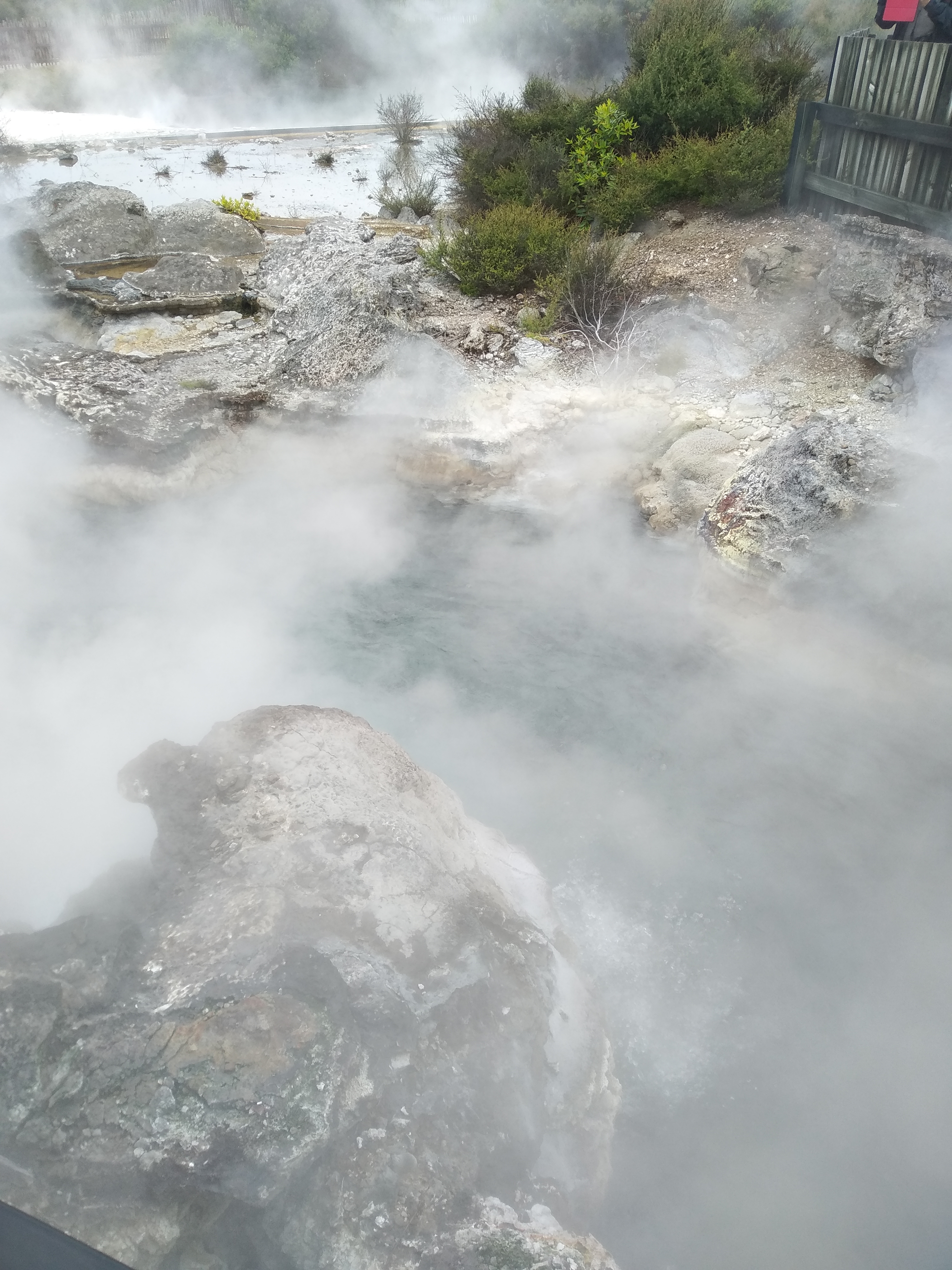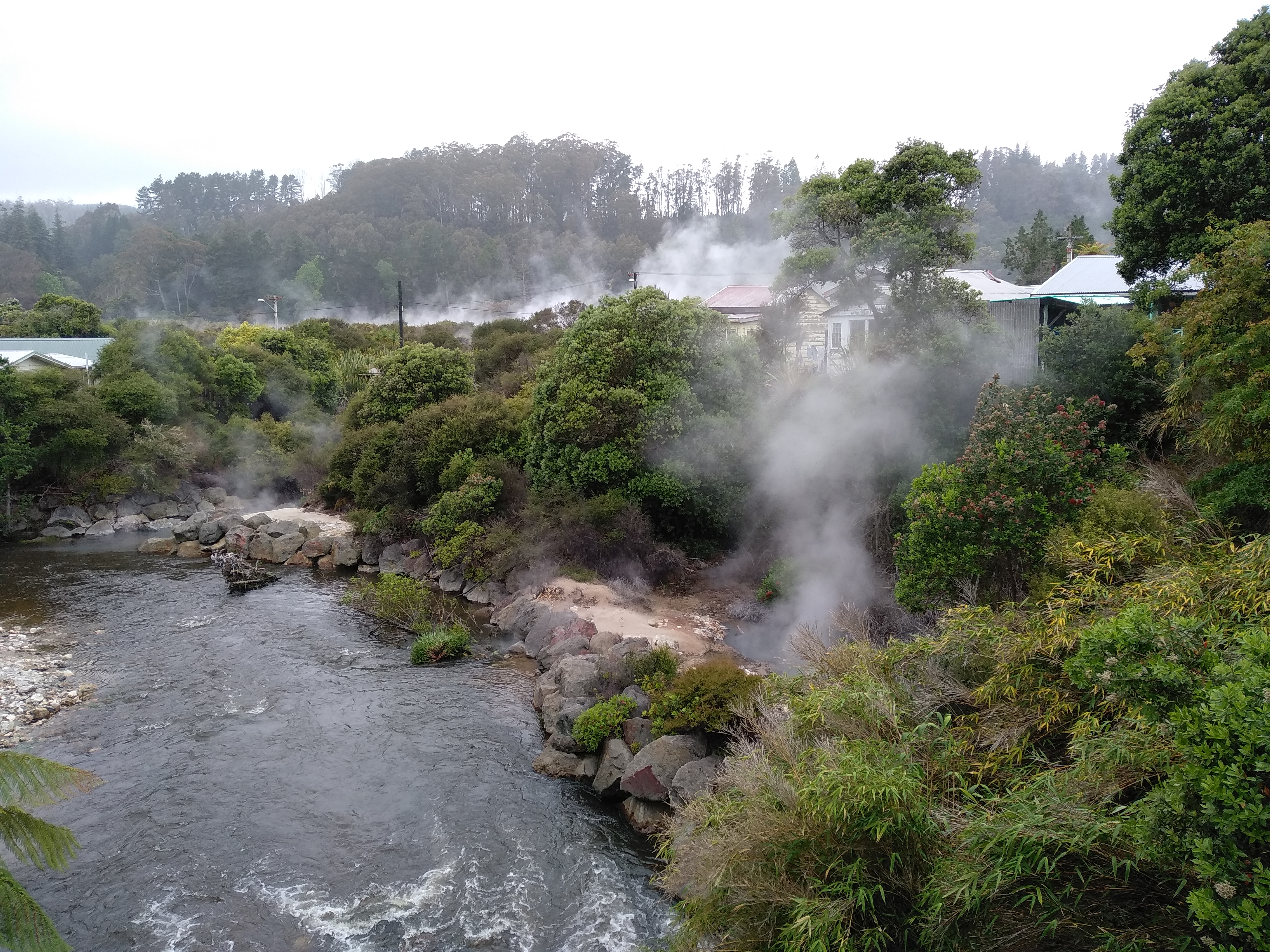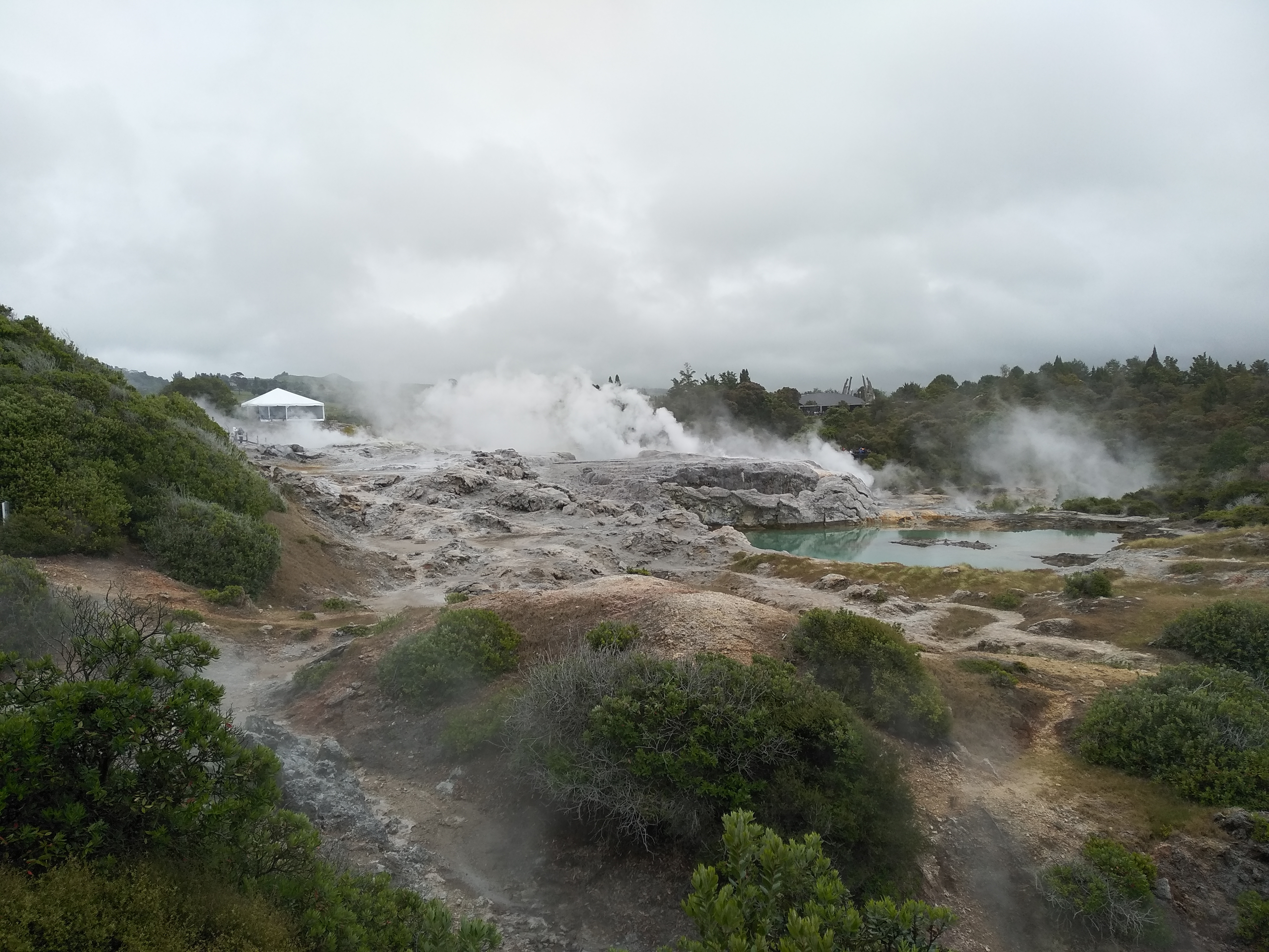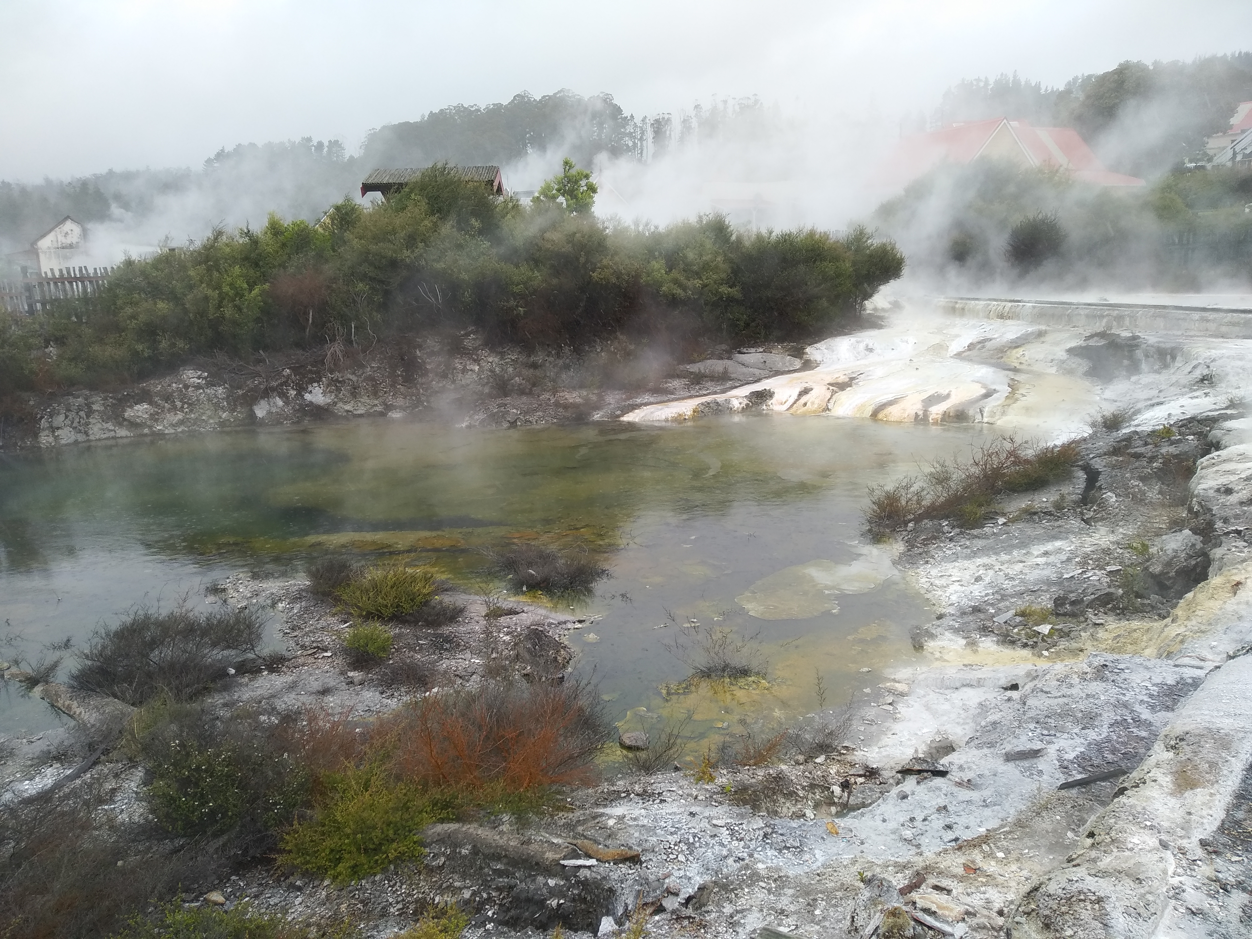 Nun sind wir in Rotorua, wo die Erde aus heißen Quellen blubbert und hohe Geysire spucken! Die Luftfeuchtigkeit von unten und oben ist sehr hoch!