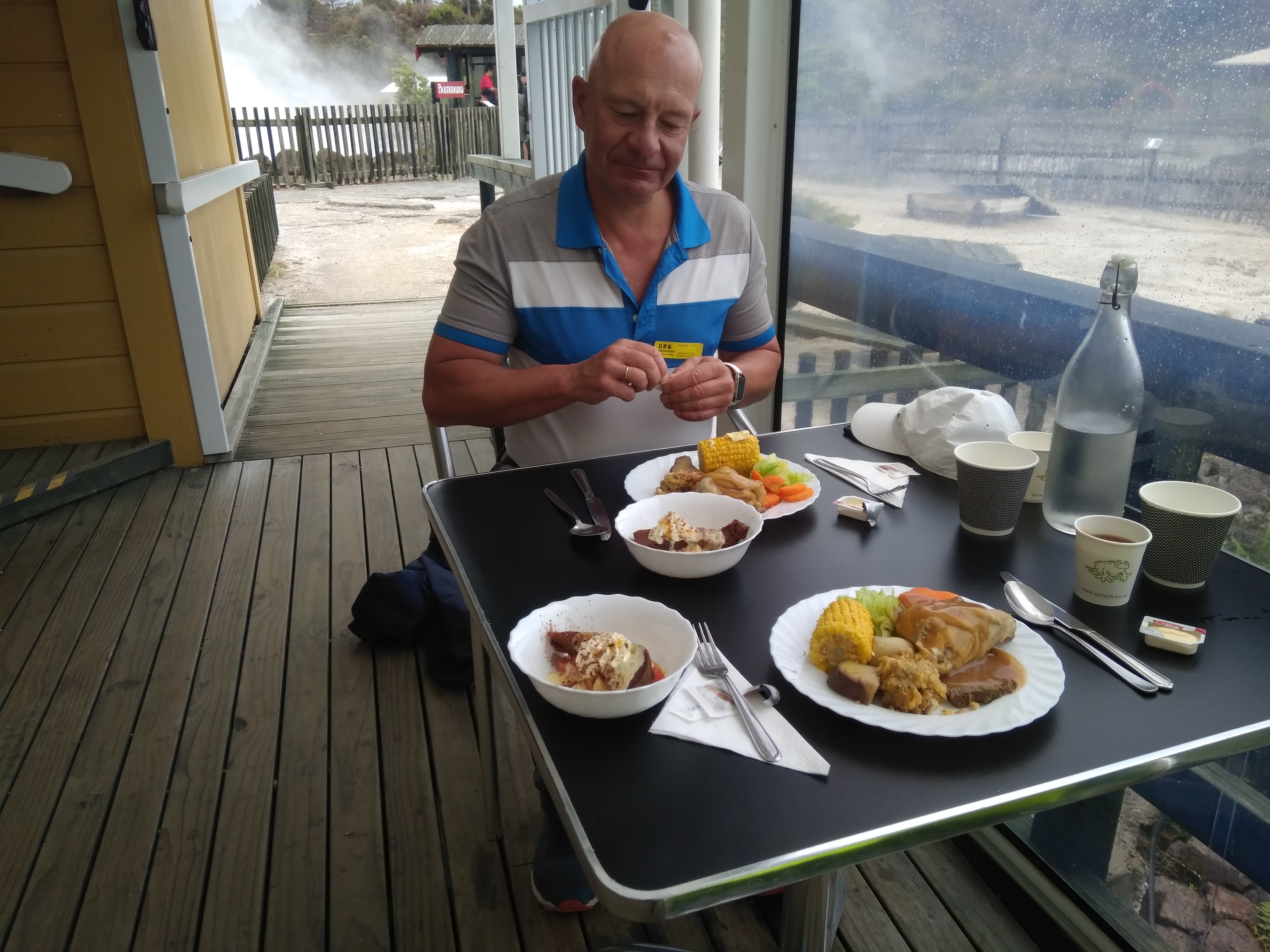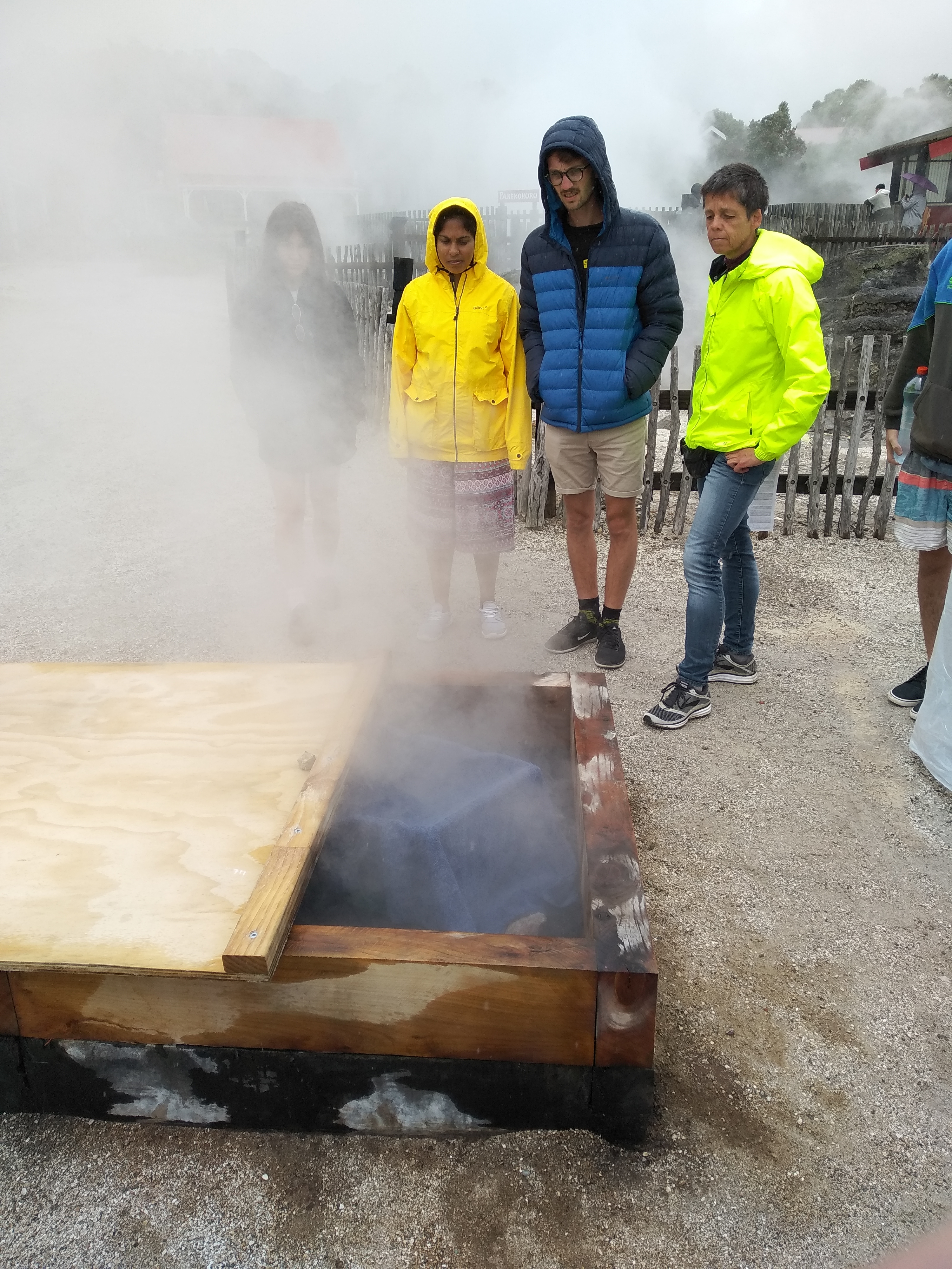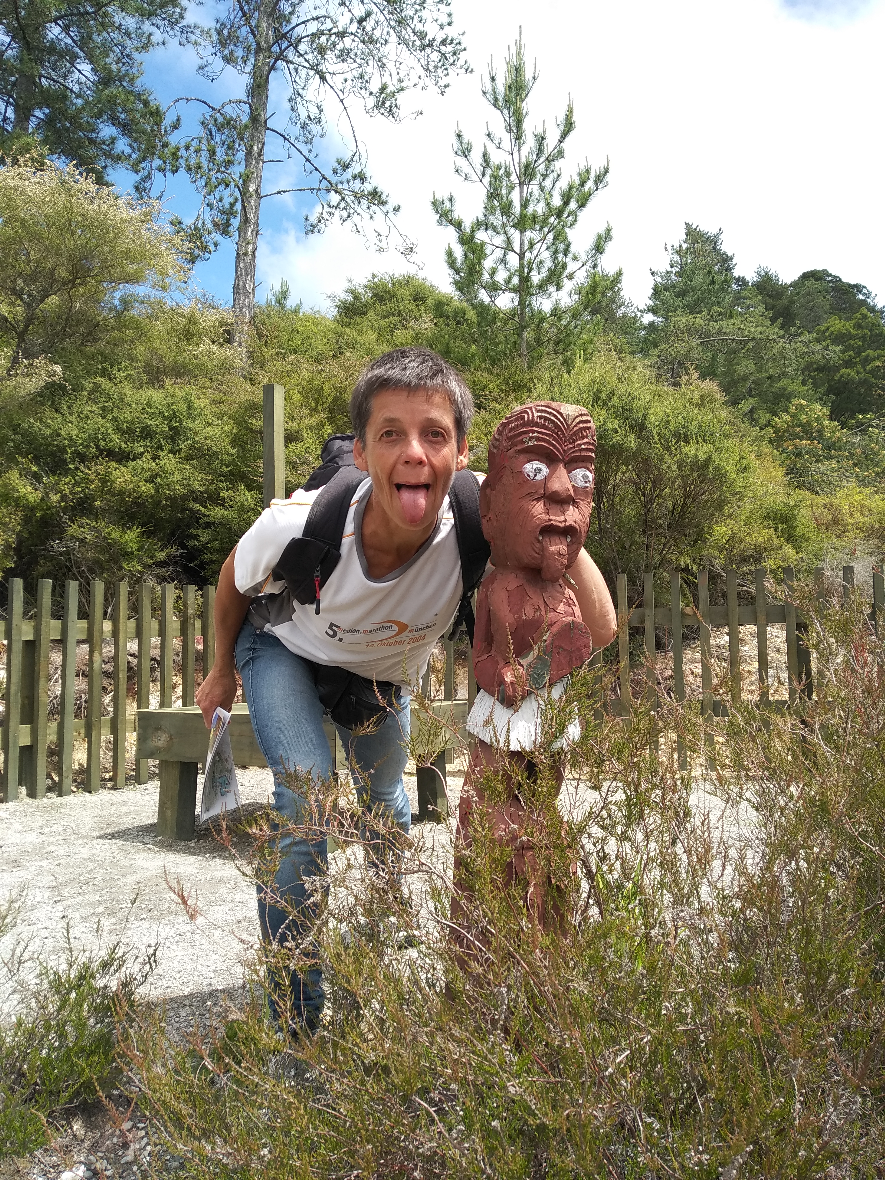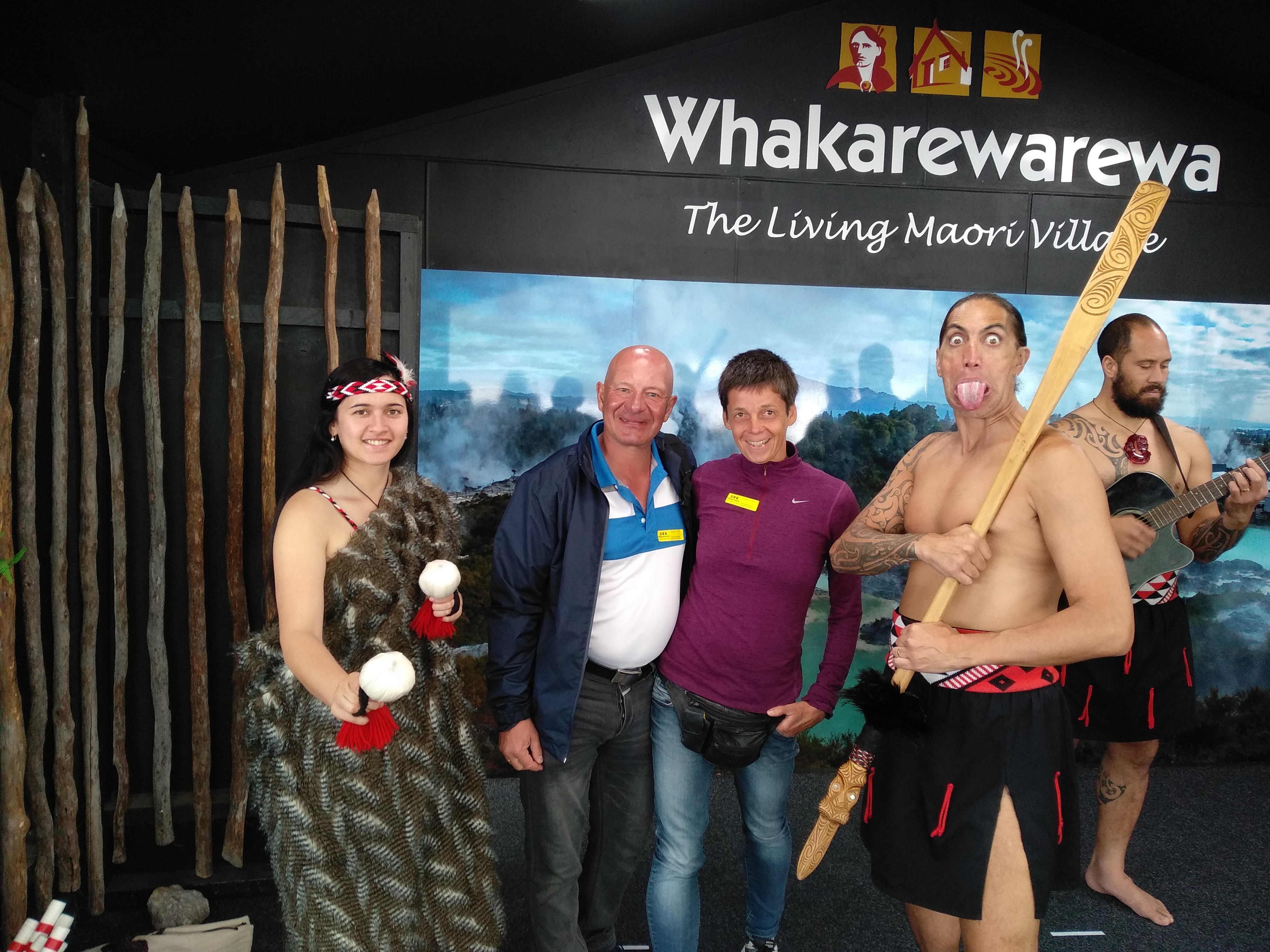 Wir sind in die Maori-Geschichte und Kultur eingetaucht und wurden von einer Maori durch ein bewohntes Dorf geführt, vorbei an brodelnden, heißen Blubberquellen, wo sie ihr Essen in „Kochkisten“ garen, in Schwefelquelle baden mit atemberaubenden Blicken auf spuckende Geysire. Sogar eine Kostprobe ihrer traditionellen Gesänge und Tänze haben wir erlebt, selten haben wir so große Augen und so lange Zungen gesehen! Das alles – incl. des hervorragenden Essens -war tief beeindruckend. Die Leute waren superfreundlich und ihre Maxime „we have no strangers in our village“ haben sie wunderbar vermittelt, da können wir uns eine Scheibe abschneiden!