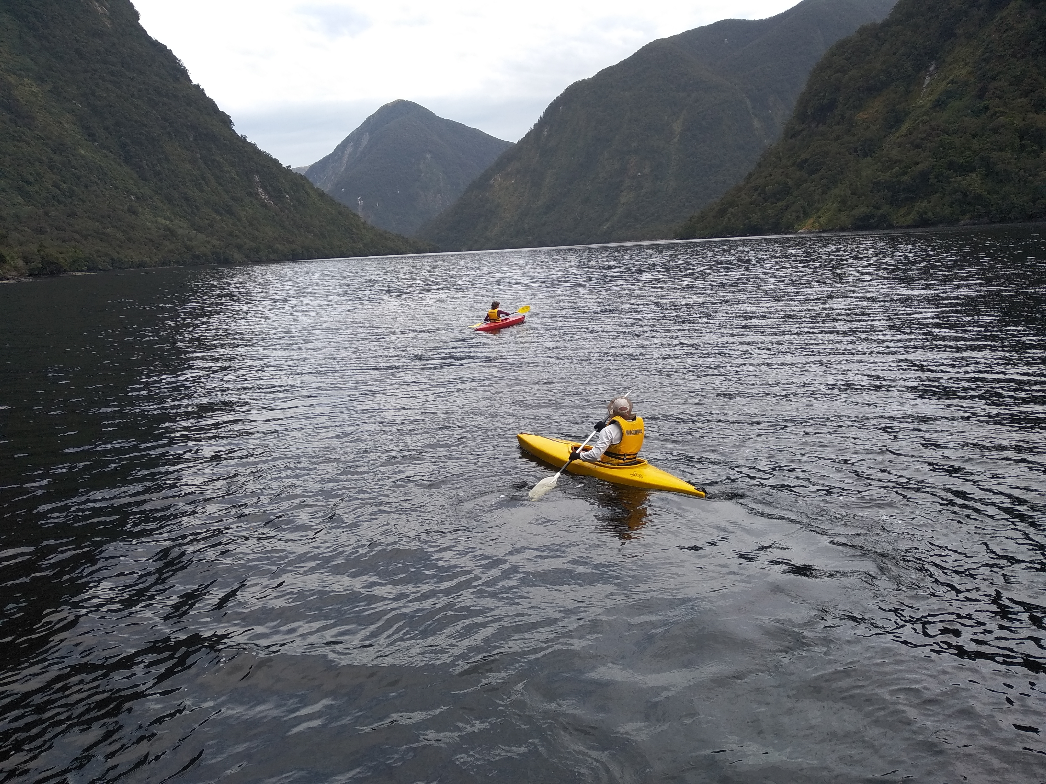 Den Nachmittag verbrachten wir mit staunenden Blicken auf die steile Fjordlanschaft mit ihren vielen Wasserfällen, sind eine ganze Weile auch Kayak gefahren und haben danach unser Abendessen – Blue Cod- geangelt! Chris hat die großen Fische gleich ausgenommen, was uns das sonst seltene Glück bescherte, von 12 Albatrossen umringt zu sein, die sich auf die Fütterung mit den Fischresten freuten und uns ein großartiges Schauspiel boten! Dann gings vorbei an großen Robbenkolonien hin zu Chris seinen Craifish-Fangkörben, die sein Assistent rauszog, das Mittagessen für morgen UND das Geschenk für jeden zum Abschied, so war unser übernächstes Abendessen also auch schon gesichert!